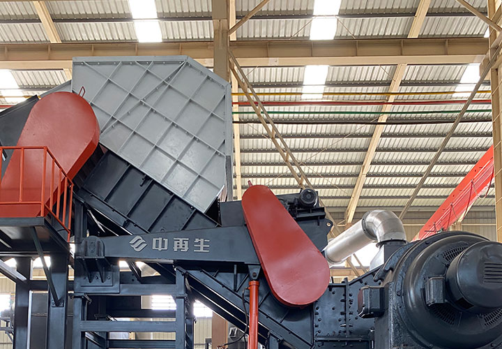 破碎線主機殼體采用特厚鋼板制造,內襯為高錳鑄鋼件,可更換;主機轉子盤安裝于水平軸上,轉子盤圓周分布有銷軸,軸向懸有錘頭;主軸用滾珠軸承支撐,循環油強制潤滑冷卻,并裝有溫度傳感器;進料口裝有液壓輥筒喂料裝置,位置一高一低,同向旋轉,能將大件松散物料壓扁,送入破碎腔內。