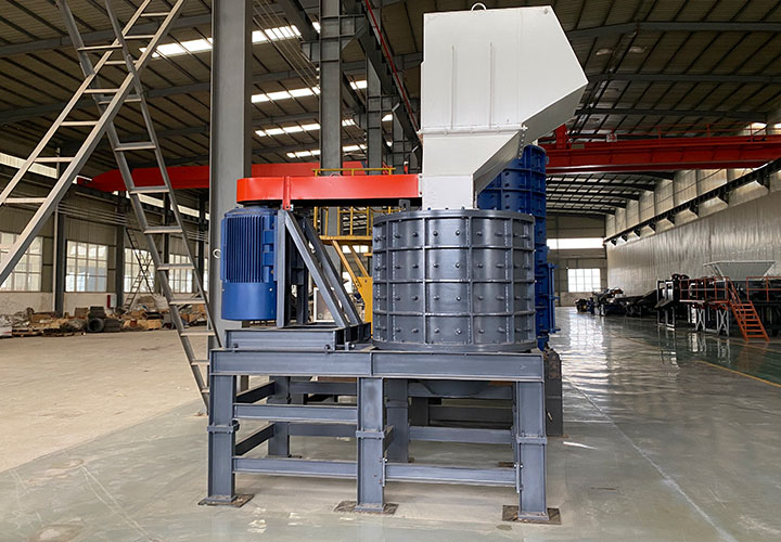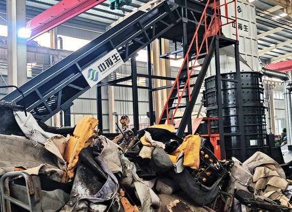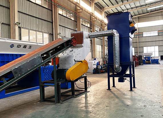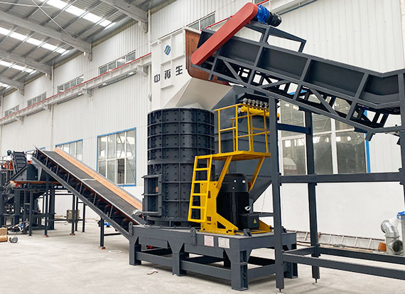 破碎線主機殼體采用特厚鋼板制造,內襯為高錳鑄鋼件,可更換;主機轉子盤安裝于水平軸上,轉子盤圓周分布有銷軸,軸向懸有錘頭;主軸用滾珠軸承支撐,循環油強制潤滑冷卻,并裝有溫度傳感器;進料口裝有液壓輥筒喂料裝置,位置一高一低,同向旋轉,能將大件松散物料壓扁,送入破碎腔內。